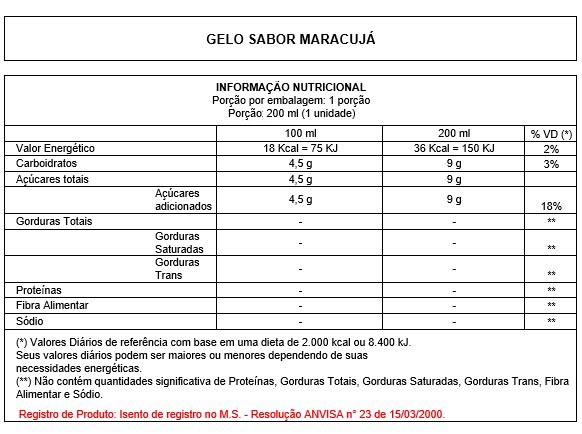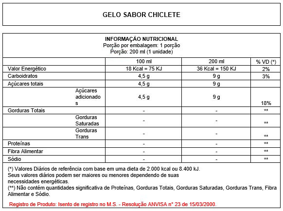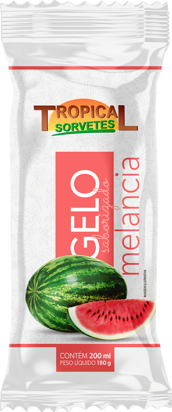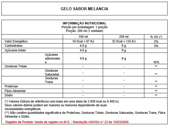INGREDIENTES: ÁGUA FILTRADA, AÇÚCAR, AMIDO DE MILHO, REGULADOR DE ACIDEZ: ÁCIDO FUMÁRICO, ACIDULANTE: ÁCIDO CÍTRICO, UMECTANTE: FOSFATO TRICALCICO, CORANTES ARTIFICIAIS: AMARANTO E AMARELO CREPÚSCULO, AROMATIZANTE SINTÉTICO IDÊNTICO AO NATURAL DE MELANCIA;