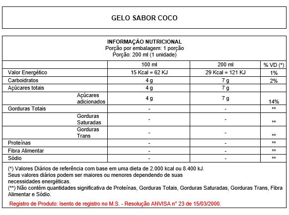 INGREDIENTES: ÁGUA FILTRADA, AÇÚCAR, AROMATIZANTE ARTIFICIAL DE COCO E CORANTE TARTRAZINA (<1%);