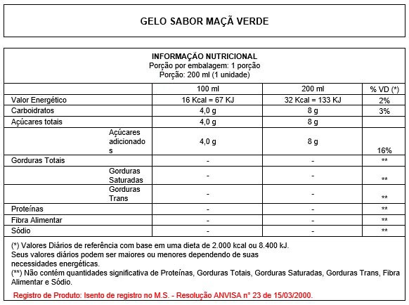 INGREDIENTES: ÁGUA FILTRADA, AÇÚCAR, AMIDO DE MILHO, REGULADOR DE ACIDEZ: ÁCIDO FUMÁRICO, AROMATIZANTE SINTÉTICO IDÊNTICO AO NATURAL MAÇÃ VERDE, ANTIUMECTANTE: DIÓXIDO DE SILÍCIO, CORANTES ARTIFICIAIS: AMARELO TARTRAZINA E AZUL INDIGOTINA. CONTÉM SULFITO (MÁXIMO) 17 PPM.
