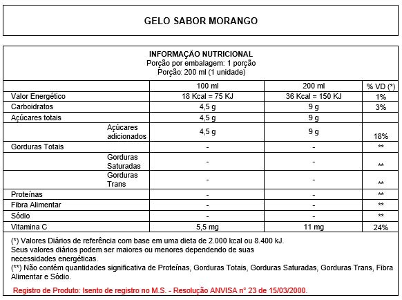 INGREDIENTES: ÁGUA FILTRADA, AÇÚCAR, POLPA DE MORANGO DESIDRATADA, VITAMINA C: ÁCIDO ASCÓRBICO, ACIDULANTE: ÁCIDO CÍTRICO, REGULADOR DE ACIDEZ: CITRATO DE SÓDIO E ÁCIDO FUMÁRICO, AROMATIZANTE, EDULCORANTES ARTIFICIAIS: ASPASTAME, ACESSULFAME DE POTÁSSIO E NEOTAME, ANTIUMECTANTE: FOSTATO TRICALCICO E DIÓXIDO DE SILÍCIO, ESPESSANTES: CARBOXIMETILCELULOSE SÓDICA E GOMA XANTANA, CORANTE INORGÂNICO: DIÓXIDO DE TITÂNIO, CORANTE CARAMELO IV E CORANTE ARTIFICIAL VERMELHO.